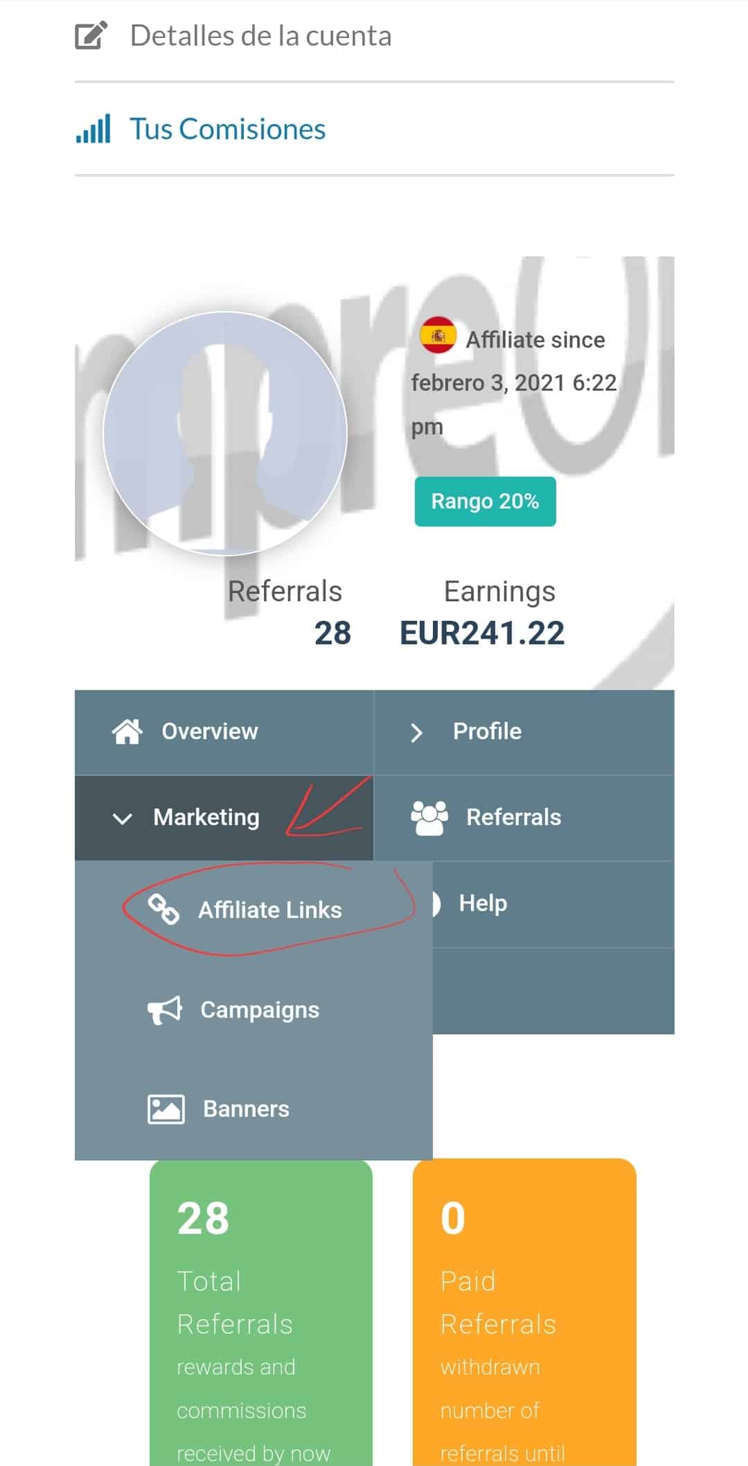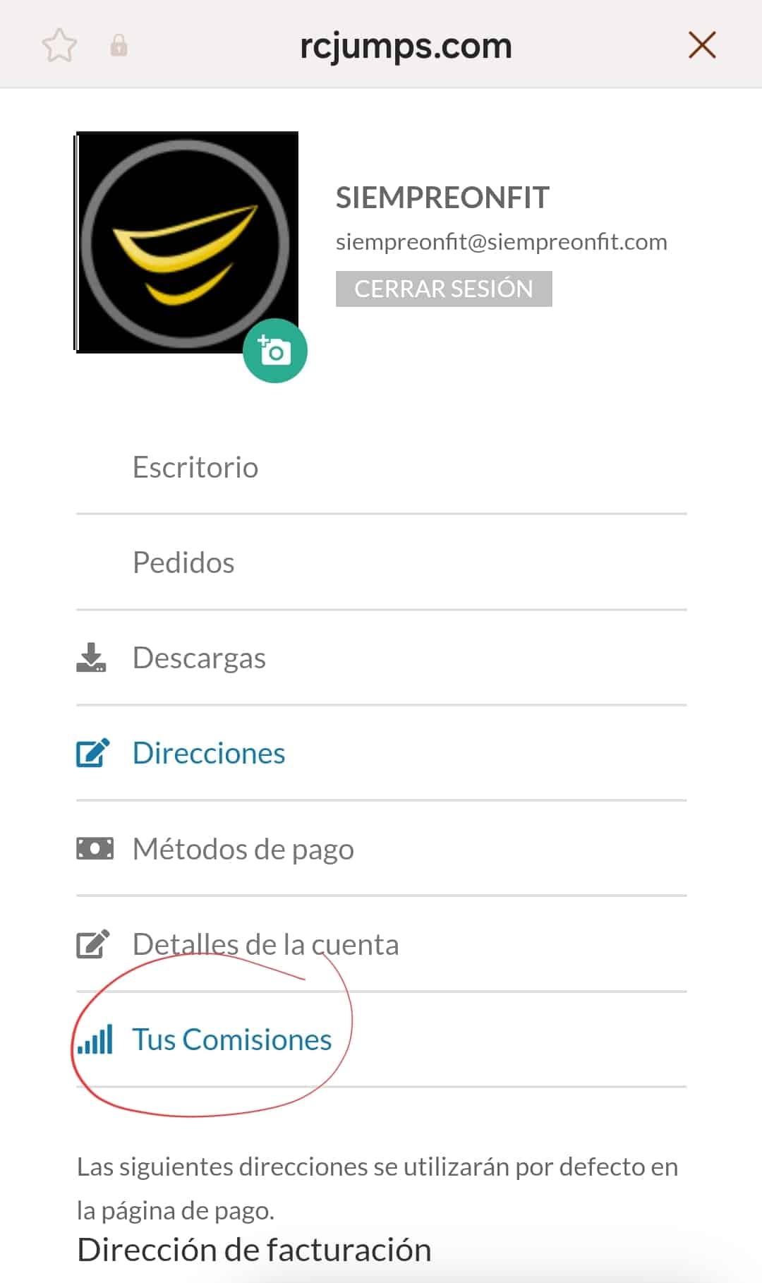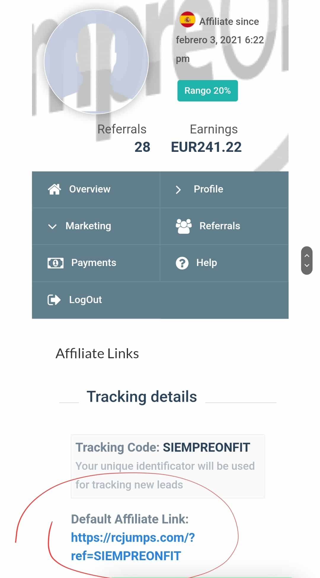 Dirígete en el Panel, a TUS COMISIONES y en MARKETING, Afiliate Link, encontrarás el enlace con el nombre http://rcjumps/ref…y tu nombre